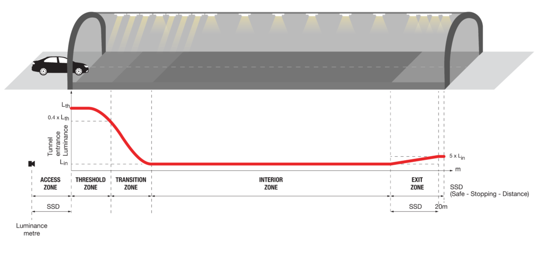 The CIE guidance categorises tunnel lighting into five core zones, plus a sixth "parting" zone located beyond the tunnel exit. Each zone tailored to ensure smooth visual adaptation for drivers moving between the brightness of daylight and the relative darkness of tunnel interiors.