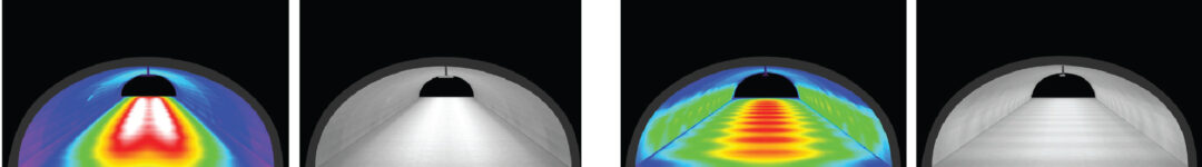 - COUNTER-BEAM LIGHTING: Light is directed against the traffic flow, enhancing contrast and object visibility in the direction of travel—a common choice for tunnels with higher traffic volumes or speeds.