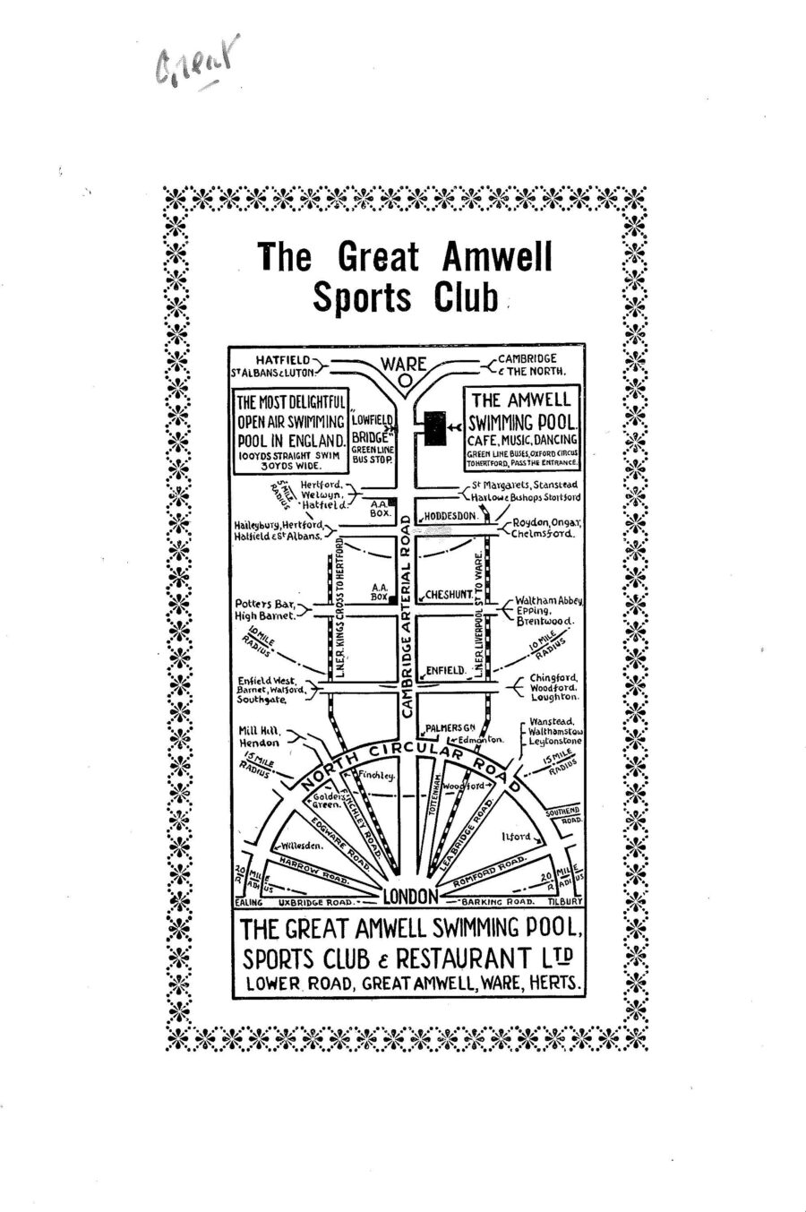 14. In the 1930’s, “The Amwell Club” was advertised as “The most delightful open air swimming pool in England” – 100 yards long and 30 yards wide and with a 30-ft high diving board.