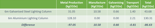 Much to people’s perception Galvanised steel columns are far more environmentally friendly than their aluminium counterparts as the table below suggests: