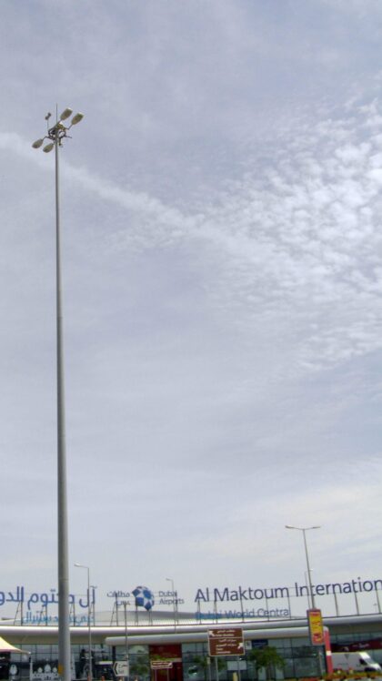 To provide replacement floodlights on existing CU Phosco 30m High Masts, lighting the main apron of Al Maktoum International Airport. It was originally supplied in 2008 with Phosco 1000 watt FL500 and 2000 watt FL550 MHN/LA floodlights with instant restrike ignitors. The Airport currently has some passenger flights but is mainly used for all air cargo for Dubai and surrounding areas, therefore, accommodating the world's largest aircraft.